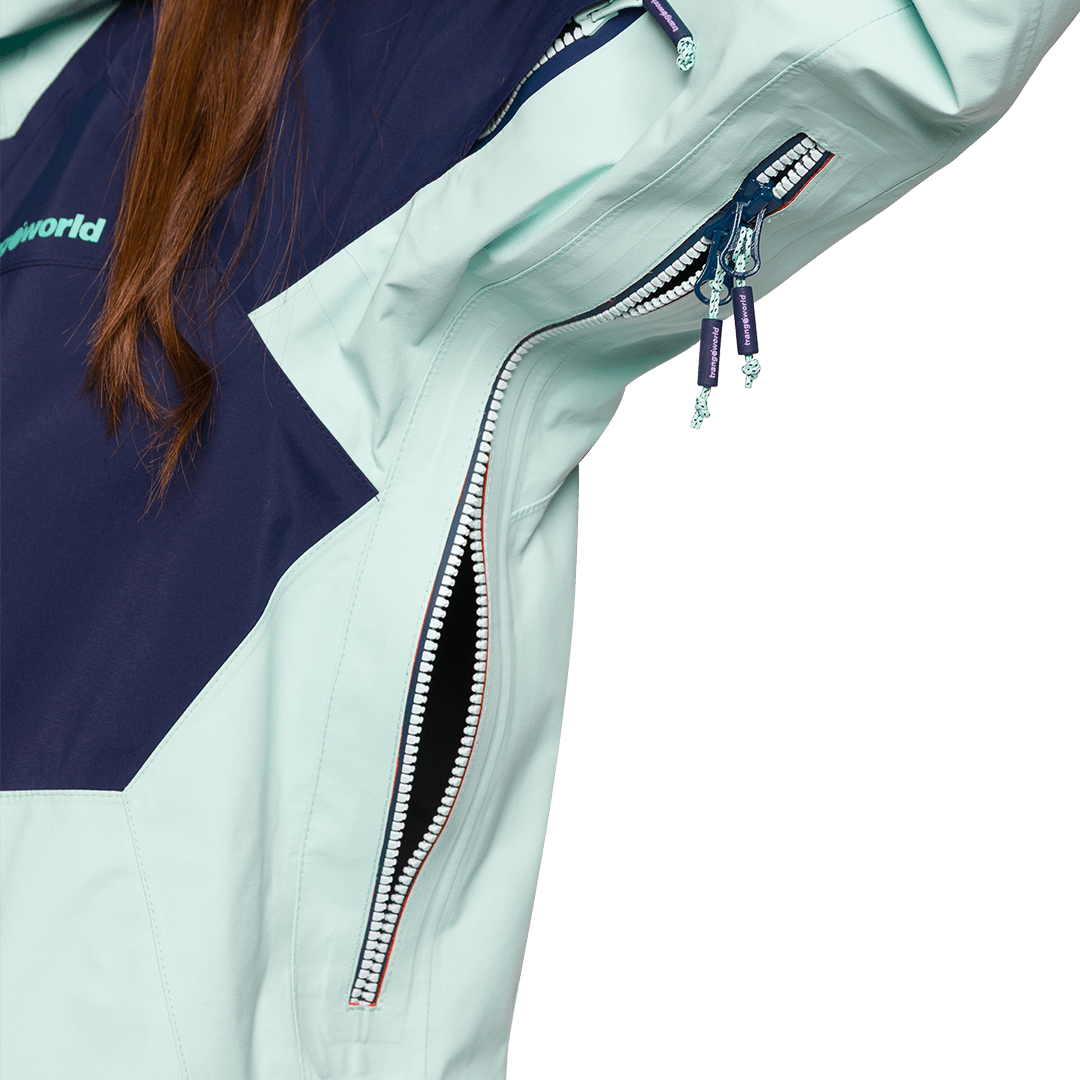 Ventilação nas axilas com zíper de cursor duplo.