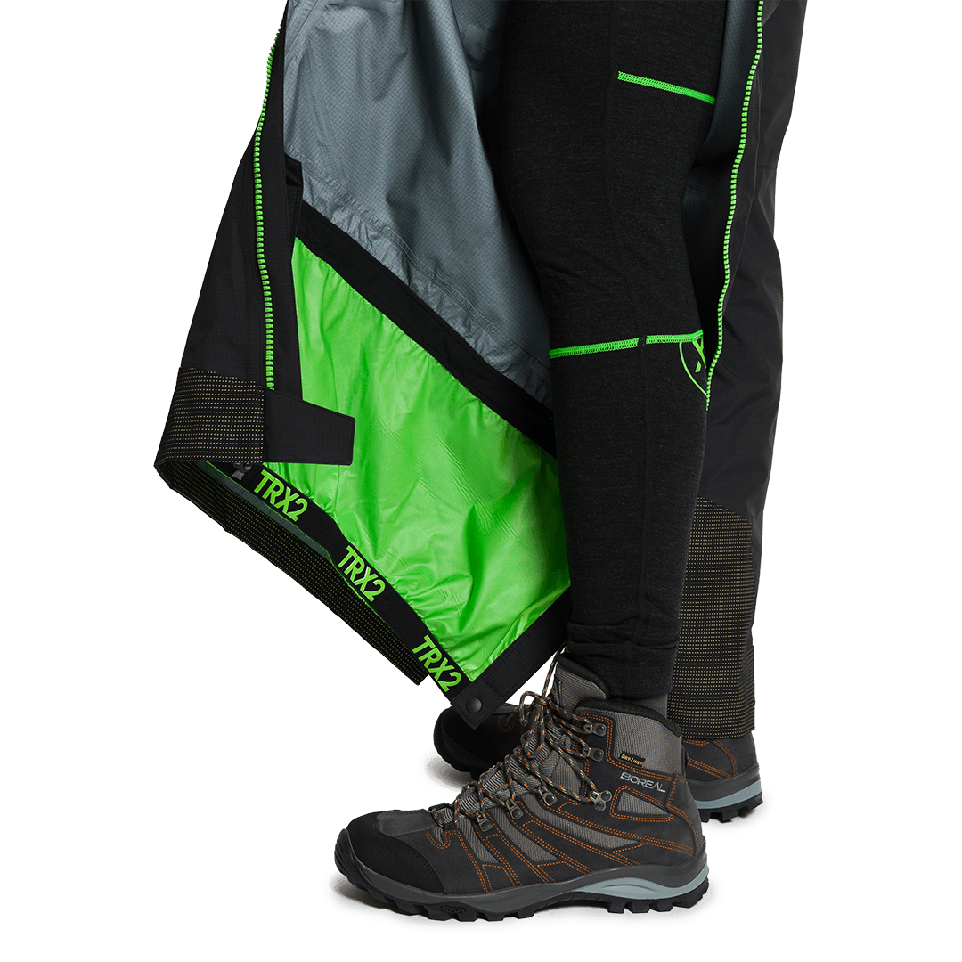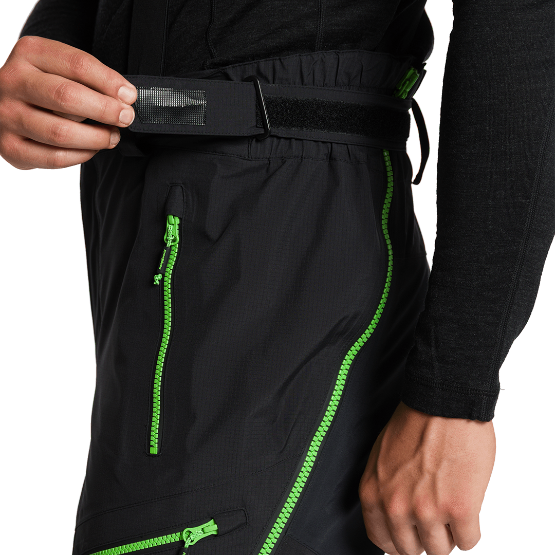 À prova d'água com coluna de água de 28.000 mm, respirável, com reforços e zíperes em todo o comprimento.