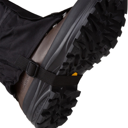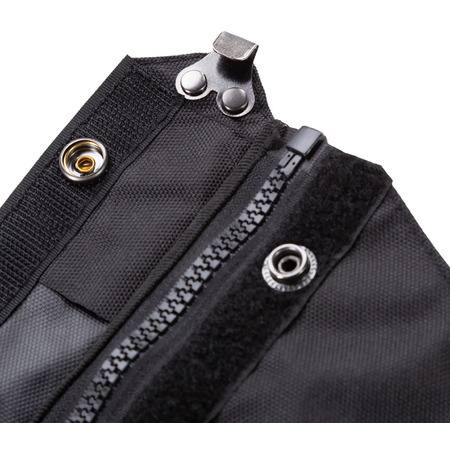 Um tornozelo elástico e bainha traseira mantêm a polaina segura ao redor da bota, enquanto o zíper e a aba de velcro mantêm a lama ou detritos fora.