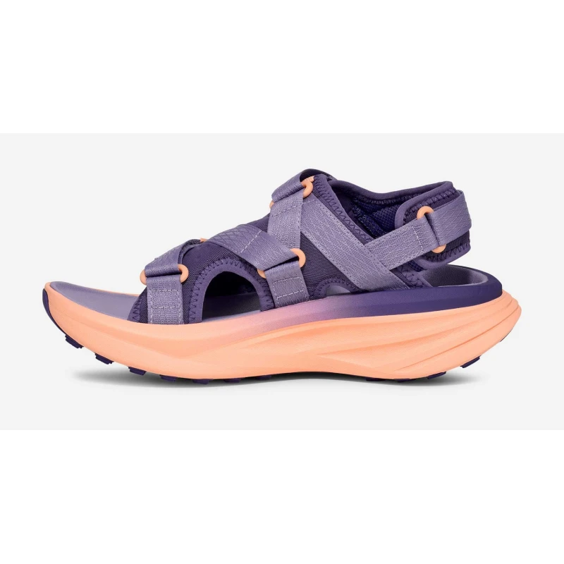 Combinando a ligereza de uma sandalia com a propulsão de umas sapatilhas de trail, esta leve sandalia de running liberta os dedos dos pés graças à sua entresuela HYPER-COMF®, seu sistema de correias de fixação e suela resistente à grava, desenhada para ir da porta de casa até a sua rota de trail mais próxima e voltar.